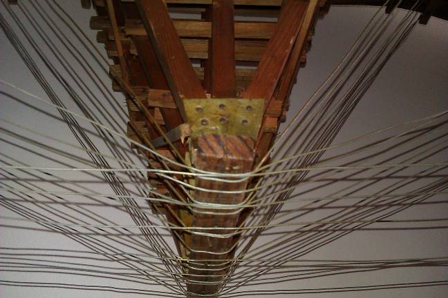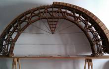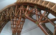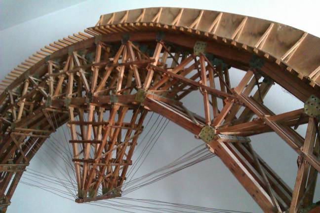 Modello e due particolari della centina del ponte del “Bus” (costruito nel 1919 nell’Alta Val Lumiei), realizzato dagli allievi della Scuola “Arti e mestieri” di Ampezzo e presentato alla mostra didattica del 1955 (modello conservato presso il Municipio di Ampezzo, foto di Sabrina Tonutti).