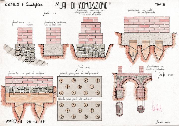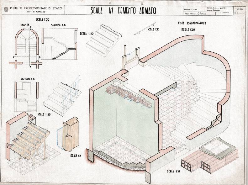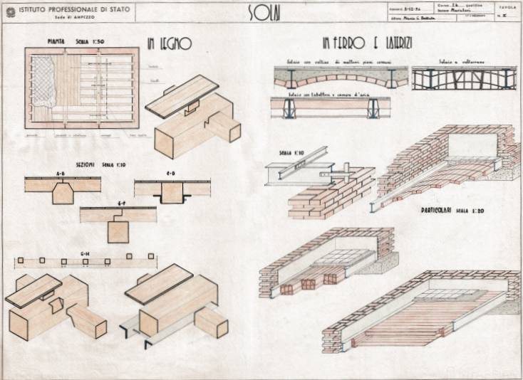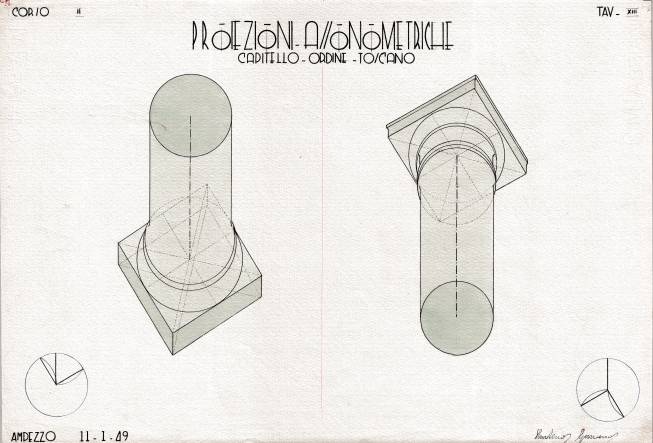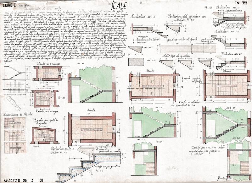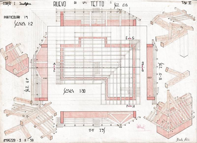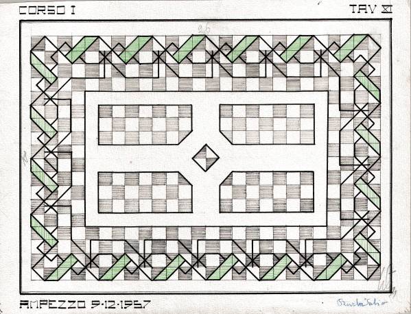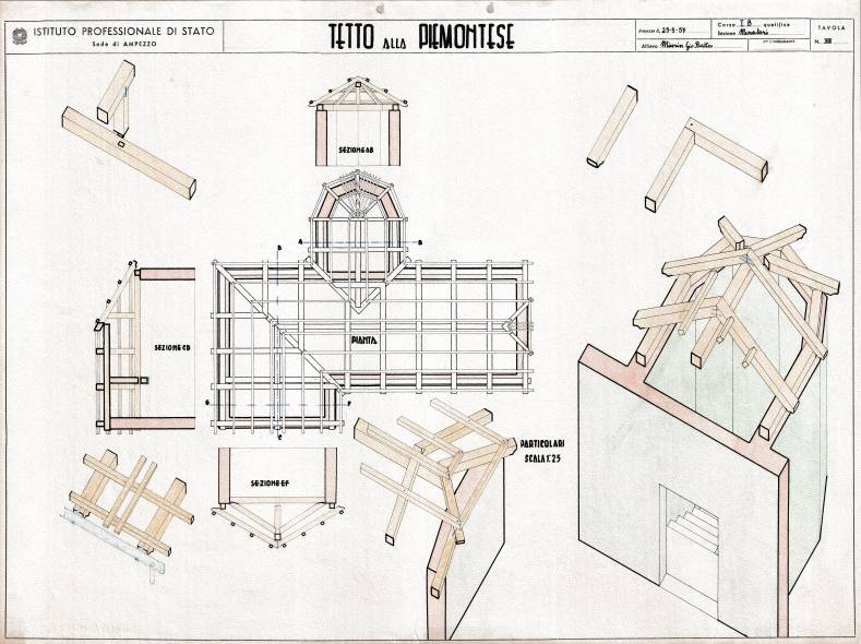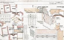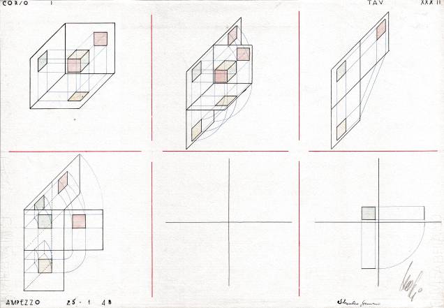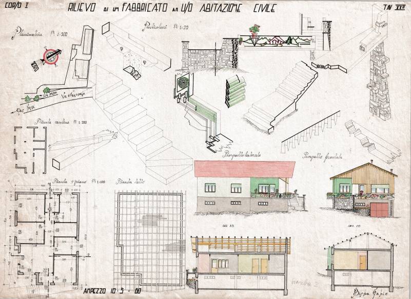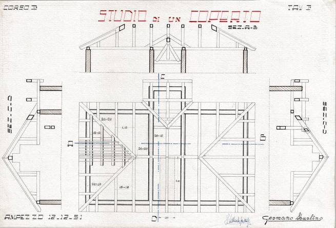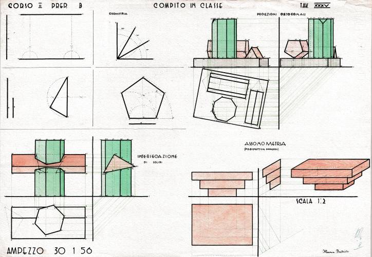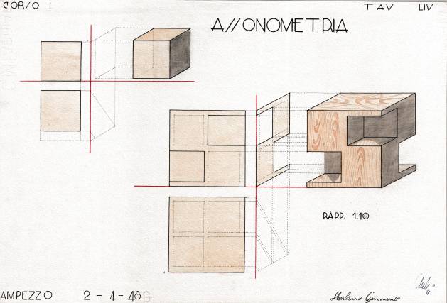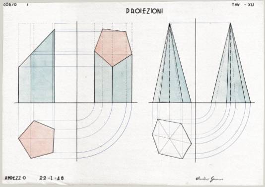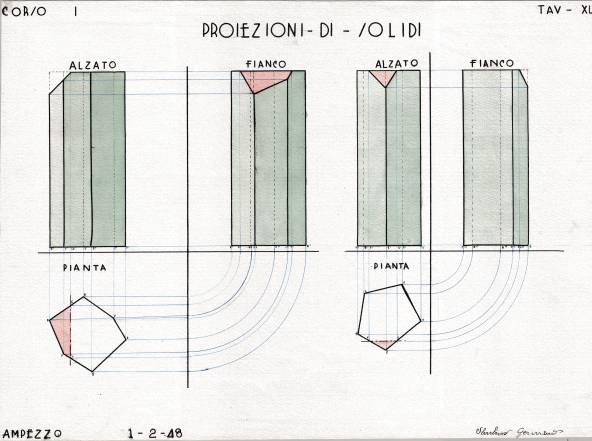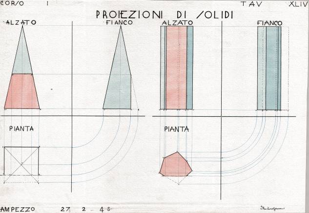 Disegni di Germano Sburlino, allievo dell’Istituto Professionale Arti e Mestieri (edili e falegnameria) di Ampezzo, anni 1948-‘51.